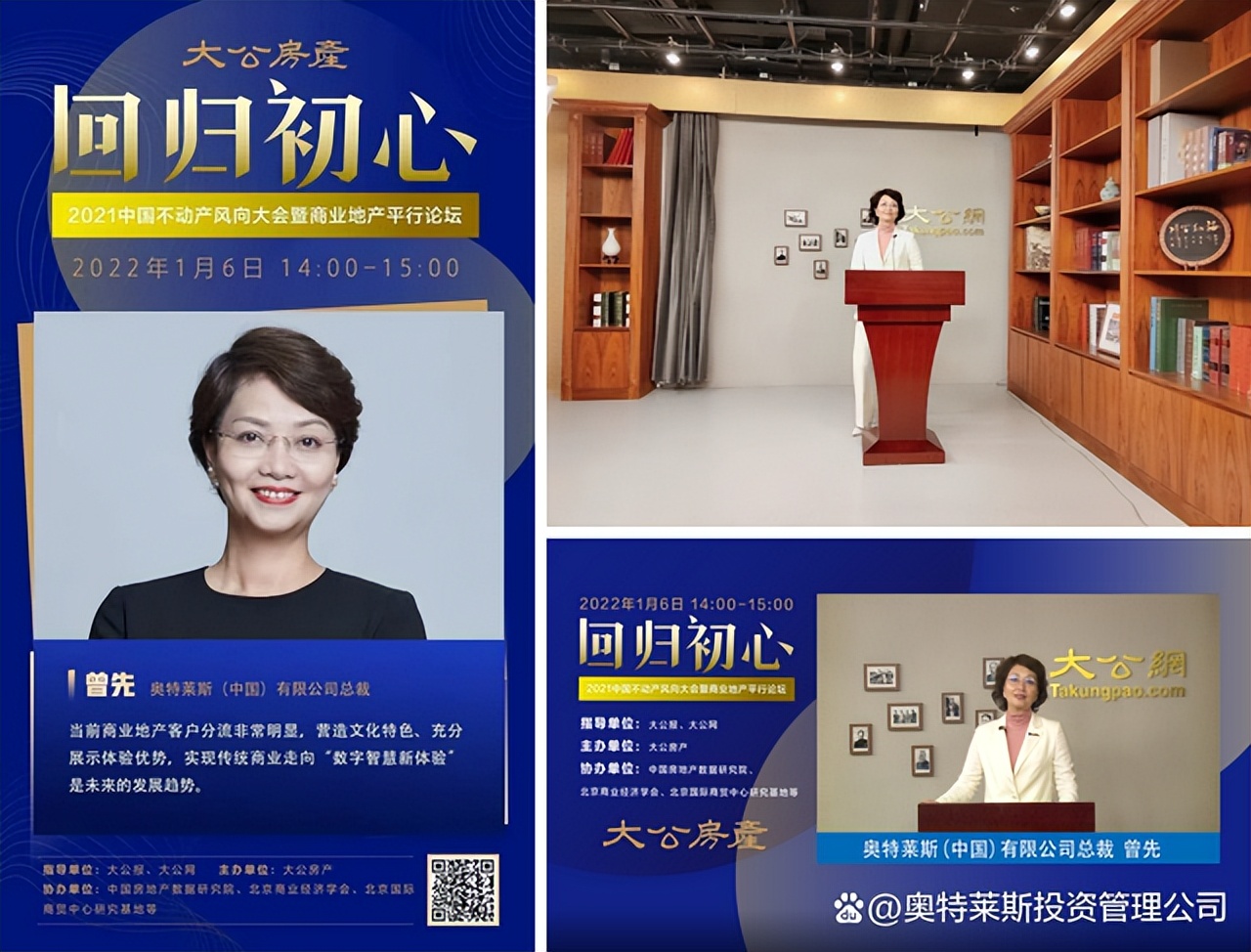 1月6日,由大公網(wǎng)房產(chǎn)頻道聯(lián)合多方機(jī)構(gòu)舉辦的“【回歸初心】——2021中國(guó)不動(dòng)產(chǎn)風(fēng)向大會(huì)暨商業(yè)地產(chǎn)平行論壇”線上直播活動(dòng)正式開始。奧特萊斯(中國(guó))有限公司總裁受邀參加本次活動(dòng),并進(jìn)行了精彩的線上直播發(fā)言。