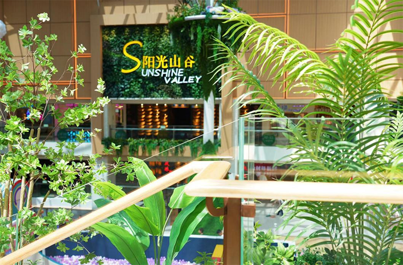 通過填補(bǔ)主中庭和動(dòng)線調(diào)整等手段,設(shè)計(jì)團(tuán)隊(duì)共打造了“云光”“藝境”“SHOW TIME” 、“陽光山谷”四大主題空間,分別對應(yīng)“美妝-云光之下的時(shí)尚美學(xué)”“生活-探尋生活中的靈感意境”“潮&趣-年輕力探索中心”“藝術(shù)-綠色有機(jī)陽光山谷邂逅藝術(shù)與美食”主力場,增強(qiáng)了品類與空間氛圍的聯(lián)結(jié)性,使一二三期動(dòng)線順暢連通,有效拉動(dòng)客流向上走。其中七樓的“陽光山谷”跨層主題空間,將自然生態(tài)的綠植元素和本地的河川山谷地貌滲透其中,把自然河谷的流線設(shè)計(jì)與室內(nèi)整體動(dòng)線的層次結(jié)合,增加了商場的游逛體驗(yàn)。
