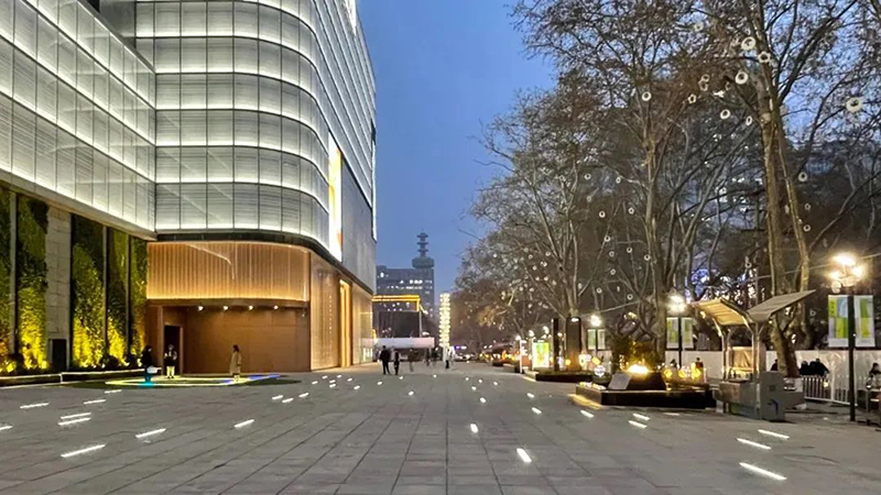 室外兩面的廣場區(qū)域分別被設(shè)計(jì)為憩(水秀廣場)、聯(lián)(商業(yè)步行通廊)、迎(慶典廣場)、趣(彈性劇場)、達(dá)(地面停車場/生活超市)五大部分,每個(gè)部分都將標(biāo)識、景觀鋪裝、綠植、親水景觀、多媒體藝術(shù)裝置等與建筑整體設(shè)計(jì)風(fēng)格進(jìn)行了統(tǒng)一,融合了現(xiàn)代、藝術(shù)、科技與綠色的室外區(qū)域營造出了宜人舒適的氛圍。