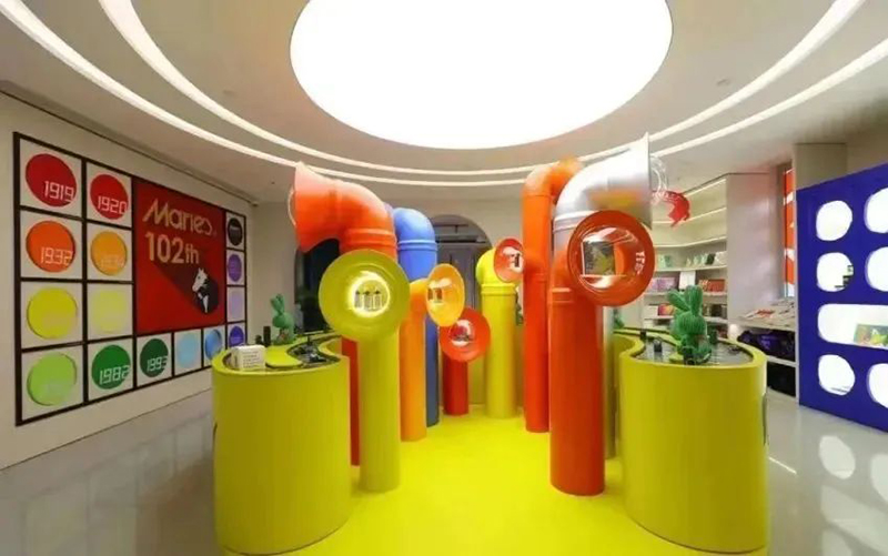 Mamǎfufú將“小紅閑”這一概念發(fā)揮得淋漓盡致,無論是整體的場景風格,對于色彩的靈活運用,還是互動體驗的內(nèi)容和品牌首店引入,都創(chuàng)造了極高的出片效果,吸引眾多年輕人前來打卡消費。Mamǎfufú超級百貨是一個跨界聯(lián)合的潮流文創(chuàng)空間,占據(jù)了M+馬利位置最好的沿街二樓,無論室外的墻體,還是室內(nèi)的布置,均大面積運用了極具張力的紅黃藍三原色,將“馬利”這個百年顏料品牌的“色彩主義”貫穿于整體空間設計中。1000㎡的空間內(nèi)營造了8個主題區(qū)域,設置馬利趣味工廠、馬利畫材、POP-UP Market、色彩理想國、靈感書集、色彩生活集市、色彩沙龍等主題區(qū)域,涵蓋藝術展覽、手工工作室、畫材、圖書、生活家居、藝術衍生、服裝零售等多種業(yè)態(tài)內(nèi)容。