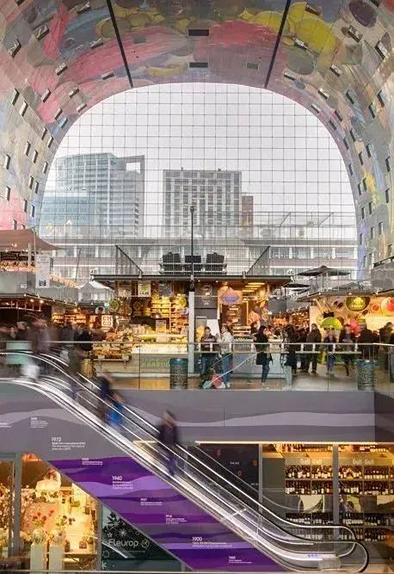 開創(chuàng)「美食市集」先河的荷蘭Markthal市場,自2014年開業(yè)以來,就受到全球各界人士的關(guān)注,年均吸引參觀游客達(dá)4.5-7百萬人次。作為荷蘭全國第一家室內(nèi)市集,以及結(jié)合居住和購物的新城市建筑類型,成功從傳統(tǒng)的菜市場轉(zhuǎn)型為具備藝術(shù)性的文藝空間、生活集市、展覽空間、創(chuàng)意工作室、綠色休閑空間以及特色居住單元空間。