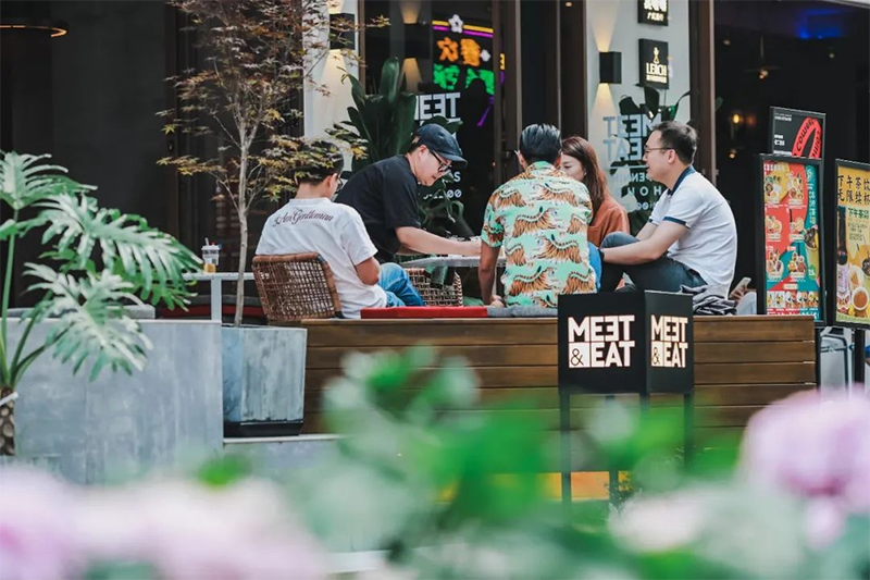 在國內(nèi),傳統(tǒng)美食廣場逐漸黯淡退場,人們更希望在美食消費場景享受到輕松愉悅的聚會和社交。MEET&EAT的創(chuàng)造團(tuán)隊比褐就通過突出“MEET”的“人與人之間的社交”來塑造場景。為突出社交感,則放大公區(qū)外部的階梯座位,也使之與成都的街巷文化進(jìn)行融合。