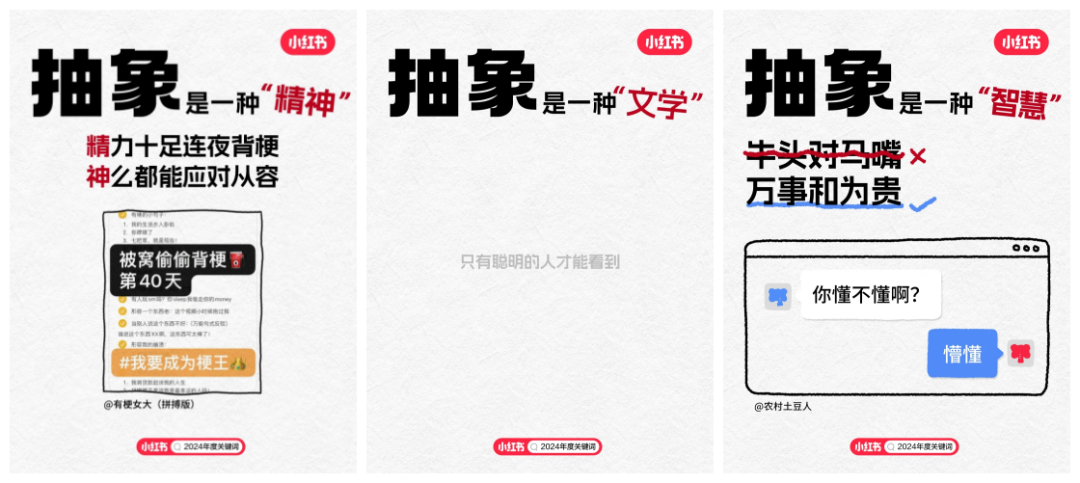 隨著2024年度關(guān)鍵詞“搞抽象”在小紅書(shū)上的火爆,我們不難發(fā)現(xiàn),無(wú)論是用戶對(duì)于生活哲學(xué)的深度探索,還是對(duì)于藝術(shù)、文化乃至日常瑣碎事物的獨(dú)特詮釋?zhuān)家砸环N前所未有的熱情被記錄與分享。