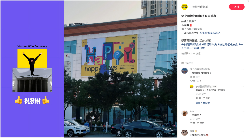 對(duì)于多數(shù)購(gòu)物中心而言,因其目標(biāo)客群相對(duì)寬泛,通過(guò)抽象文化形成“群體認(rèn)同感”的難度比品牌方更高。所以,購(gòu)物中心的抽象式營(yíng)銷(xiāo),既要出圈,又不能過(guò)于小眾。購(gòu)物中心官方發(fā)布的一條小紅書(shū)筆記能讓用戶一眼看懂,并愿意發(fā)聲回應(yīng),如此才是有效“抽象”。