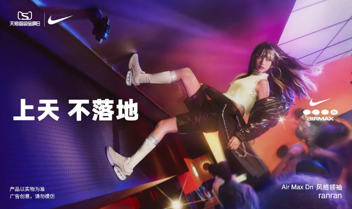 提及“發(fā)瘋”,耐克的「上天不落地」?fàn)I銷大事件也是不得不提一提的。借助新發(fā)布系列的契機,耐克與天貓超級品牌日牽手,通過與潮流人群共創(chuàng),借助城市文化加強對潮流藝術(shù)的表達,深度溝通年輕人群,在社交平臺上號召網(wǎng)友們玩轉(zhuǎn)“先瘋”穿搭共創(chuàng)。