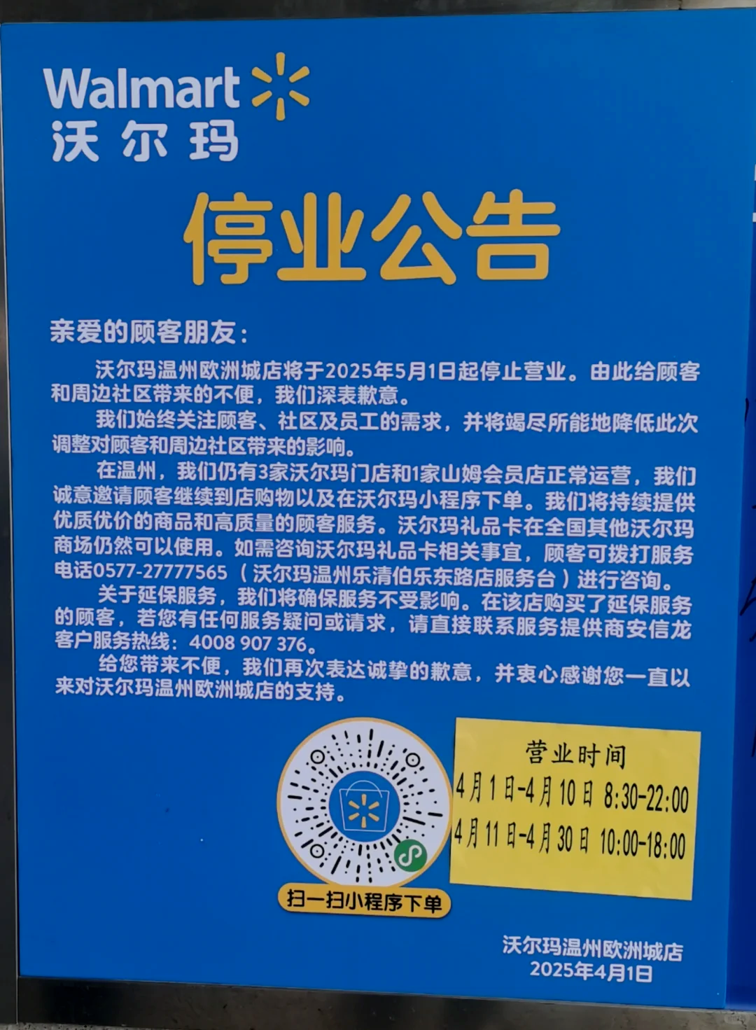 行至2025年,除了如胖東來、山姆等商超企業(yè),超市行業(yè)的生意依然難做。4月1日,沃爾瑪溫州市區(qū)最后一家門店宣布將于5月1日停業(yè),該店是繼沃爾瑪東海店、沃爾瑪鴻瑛店之后,溫州市區(qū)營業(yè)的唯一一家實體店。在關(guān)閉門店的公告中,沃爾瑪明確表示,關(guān)店原因主要歸結(jié)為戰(zhàn)略調(diào)整以及合同或租約到期。其中廣州新港店,由于所在商城整體改造升級,預計今年10月將重新開業(yè)。